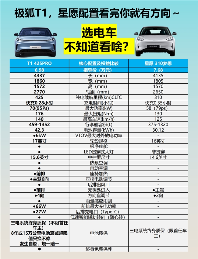 通过对比可以看出,极狐T1在空间、科技、健康和安全等方面都具备明显优势。其宽敞的乘坐空间、先进的智能泊车系统以及接近“零醛零苯”的极净座舱,都使得极狐T1成为了一款极具吸引力的车型。再加上其超国标的电池安全性能和豪华大气的轮毂规格,极狐T1无疑是10万以下预算区间内的性价比之选。对于那些注重实用性和驾驶体验的年轻消费者来说,极狐T1无疑是一个明智的选择。现在就入手极狐T1,开启你的高品质出行生活吧!